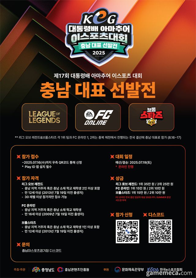 충청남도와 충남콘텐츠진흥원은 제17회 대통령배 아마추어 e스포츠 대회(대통령배 KeG) 충남 대표 선발전을 개최한다.
