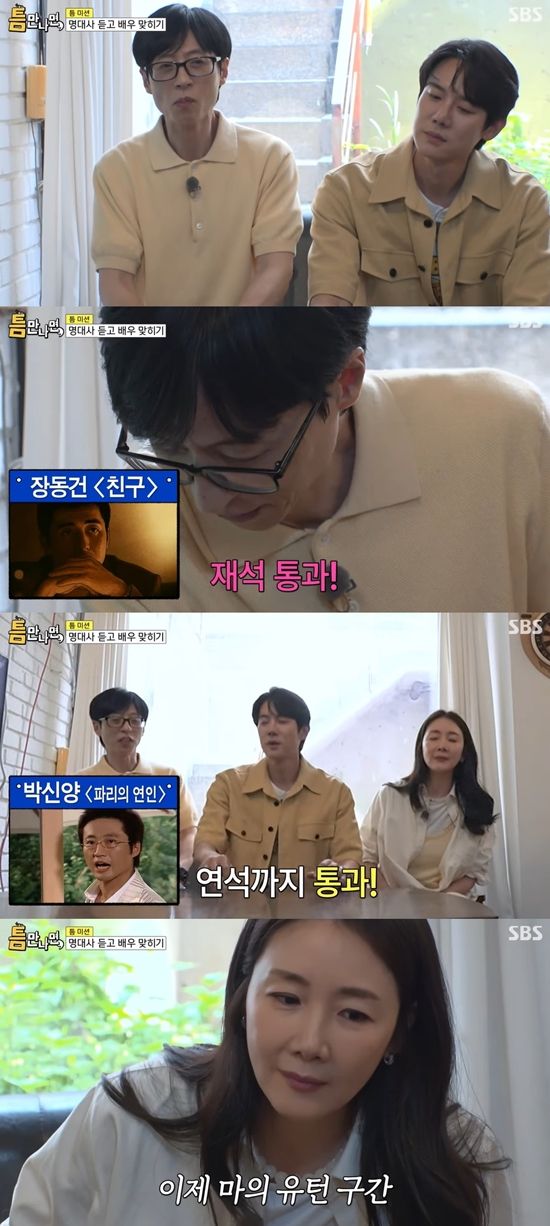 이날 방송에는 명대사를 듣고 배우를 맞히는 게임이 진행됐다. 유재석은 '니가 가라, 하와이'라는 대사를 듣고 배우 장동건의 목소리임을 손쉽게 맞혔다. 이어 유연석도 '애기야 가자'라는 대사를 듣고 "박신양 선배님"이라고 외쳤다.