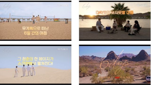 ‘6DAYS’는 음악과 낭만을 따라 달린 6일, DAY6의 시네마틱 여정을 담은 뮤직 로드무비이다. 개봉 확정 소식과 함께 온라인을 뜨겁게 달군 ‘6DAYS’가 오는 8월 13일 CGV 개봉을 확정하고 6일간의 예측불허 여정과 낭만 청춘 DAY6의 다채로운 매력을 예고하는 메인 예고편을 공개한다.