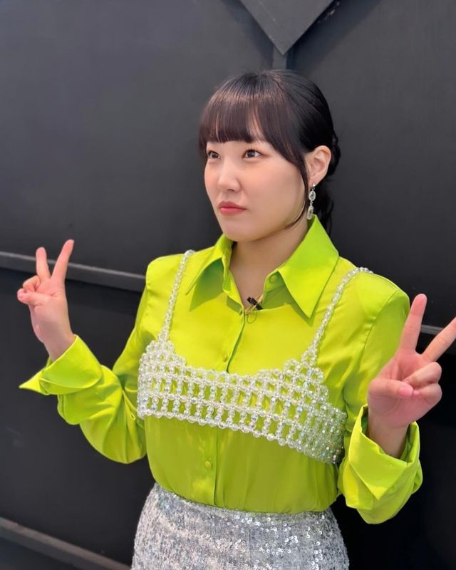 이은지의 룩을 보면 여름 햇살에도 절대 지지 않는 비비드 컬러의 활용이 돋보입니다. 라임빛 새틴 셔츠 위에 진주 비즈 브라 톱을 매치한 룩은 그야말로 화사함의 끝판왕이죠. 소재에서 오는 광택과 비즈의 입체감이 만나 시크하면서도 장난기 넘치는 무드를 완성했습니다.