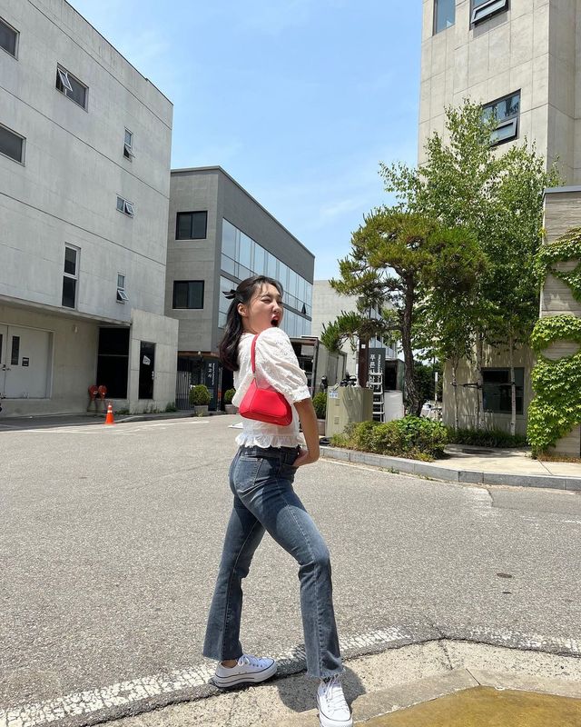 심플한 데님과 화이트 블라우스를 입을 때도 쨍한 레드 숄더백 하나로 포인트를 놓치지 않았습니다. 일상적인 청바지 룩을 단번에 스타일리시하게 만드는 방법, 이렇게나 쉽군요.