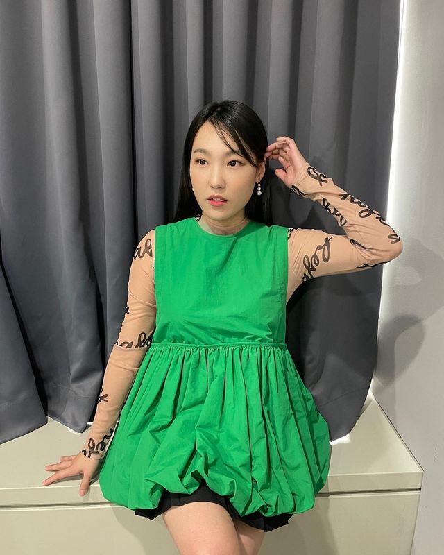 풍성한 실루엣의 초록 벌룬 드레스에 프린팅 시스루 톱을 레이어드한 패션은 패턴과 소재가 어우러져 색다른 시선을 유도하고요.