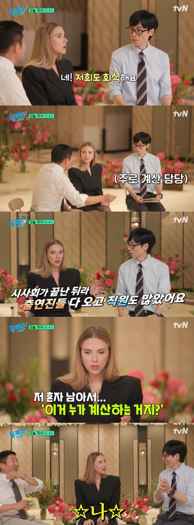 이날 스칼렛 요한슨은 "촬영이 끝나면 저희도 회식을 하고 쫑파티를 한다. 혹시 할리우드도 하나"라는 유재석의 질문에 "저희도 회식을 한다. 같이 저녁을 먹거나 바에 간다"고 답했다.