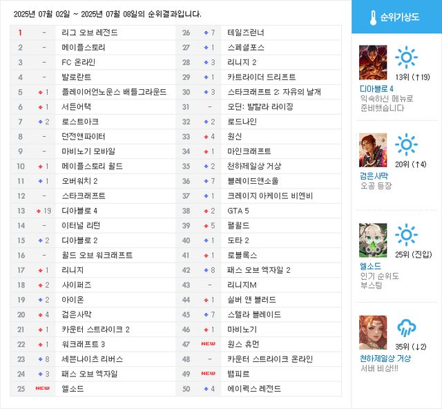 이번 주 게임메카 인기순위에서는 디아블로 4가 예견된 상승세를 보였다. 지난 2일에 시작된 시즌 9 직후 무려 19계단을 뛰어 13위에 자리했다. 그 여파로 디아블로 형제들은 물론, 비슷한 게임성을 앞세운 패스 오브 엑자일 진영은 일제히 하락했다. 특히 6월 신규 리그 후 21위를 지키고 있던 패스 오브 엑자일은 2주 만에 하락세로 돌아서며 직격타를 맞았다. 핵앤슬래시 진영을 디아블로 4가 뜨겁게 휘저은 셈이다.