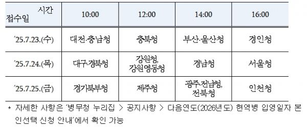 지역별로 접수 일정이 다르고, 선착순 마감되므로 사전에 병무청 누리집 공지사항을 확인하여 본인의 관할 지방병무청과 접수일시, 유의사항을 미리 알아두어야 한다.