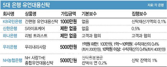 이런 흐름은 다른 은행에서도 나타나고 있다. 우리은행은 유언대용신탁 가입 금액을 5억원에서 5000만원으로 내렸다. NH농협은행도 ‘NH 사랑THE 종합유언대용신탁’도 리뉴얼해 최소 가입금액을 기존 3억원에서 금전 외 재산 합산 1억원, 금전 기준 5000만원으로 대폭 낮췄다. 신한은행과 하나은행은 별도의 최소 가입금액을 규정하지 않았다.