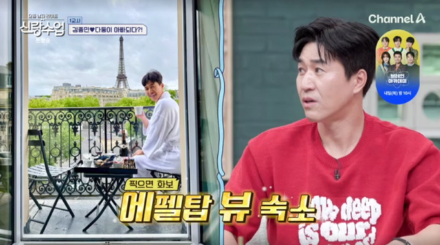 에펠탑 뷰가 보이는 호텔 사진이 공개되자 심진화는 “숙소가 알려달라”고 말하자 김종민은 “작은데 되게 비싸다”라고 말해 웃음을 자아냈다. 그러면서 “프랑스 남부에 갔다가 스위스까지 갔다. 아내가 융프라우에서 패러글라이딩을 하자고 했다. 그런데 안뛰었다”고 설명했다.