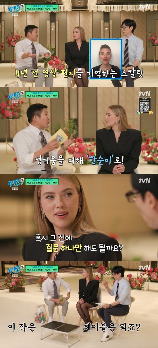 이날 스칼릿 조핸슨은 "너무 오래 걸렸다. 저도 '유퀴즈'에 나오는 걸 기다렸다"라며 밝혔고, 조세호는 "기억하시냐. 4년 전에 영상 편지를 보내셨다"라며 반가움을 드러냈다. 제작진은 스칼릿 조핸슨이 4년 전에 유재석과 조세호에게 보낸 영상 편지를 공개해 눈길을 끌었다.