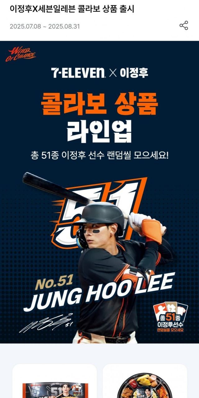 이정후 콜라보 상품에는 이정후 선수 랜덤씰이 동봉돼 있다. 이정후 랜덤씰은 총 51종으로, 9장의 씰을 모으면 등번호 '51', 'Wind of Change' 등의 문구가 완성되는 퍼즐형 랜덤씰 45종과 스페셜 랜덤씰(유니폼, 사인, 행운부적) 6종이다.