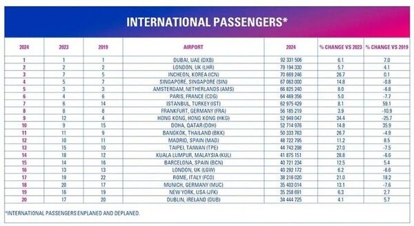 1위는 미국 애틀랜타 국제공항(ATU, 1억806만명), 2위는 두바이 국제공항(9233만명), 3위는 미국 댈러스/포트워스 국제공항(DFW, 8781만명), 4위는 일본 도쿄 하네다 국제공항(HND, 8590만명), 5위는 영국 히스로 국제공항(8388만명)이다.