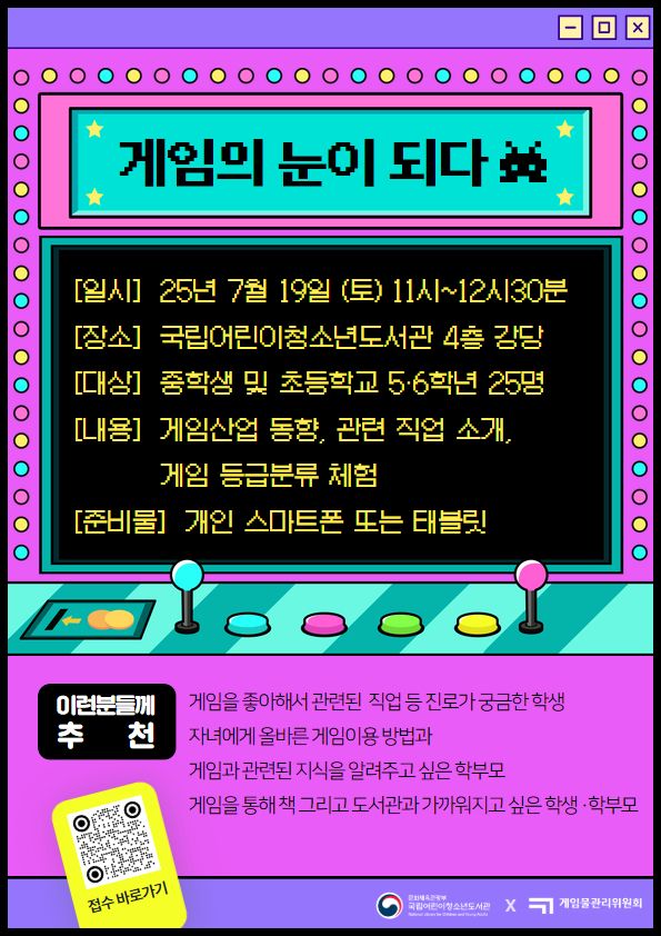 국립어린이청소년도서관과 게임물관리위원회(이하 ‘게임위’)는 7월 19일 초등학생 고학년과 중학생을 대상으로 게임 분야 진로체험 프로그램 ‘게임의 눈이 되다!’를 운영한다.