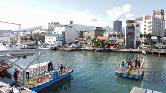 속초 청초호에서 새로 교체괸 갯배가 운영되고 있다. 갯배는 1998년부터 지역주민과 관광객이 속초시내와 청호동 아바이마을을 오가기 위해 이용해온 무동력 해상교통수단이다. / 뉴스1