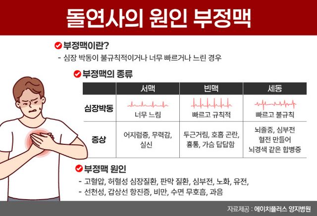 에이치플러스 양지병원 최규영 심장내과 전문의는 “부정맥은 서맥, 빈맥, 세동으로 구분할 수 있다”고 설명하며, “서맥은 심장이 비정상적으로 느리게 뛰는 것으로, 어지럼증·무력감·실신 등의 증상이 나타나고, 빈맥은 심장이 분당 100회 이상 빠르게 뛰는 상태로, 두근거림·흉통·호흡곤란 등의 증상을 동반한다”고 말했다. 또한 최 전문의는 “세동은 뇌졸중이나 심부전을 유발할 수 있는 고위험 부정맥으로, 혈전이 형성돼 뇌경색 등 합병증 위험도 높다”고 덧붙였다.