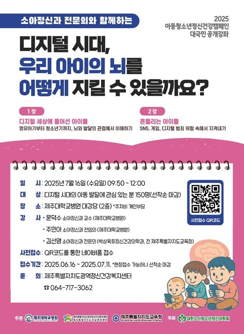 제주특별자치도광역정신건강복지센터는 오는 16일 제주대학교병원 대강당에서 '디지털 시대, 우리 아이의 뇌를 어떻게 지킬 수 있을까요?'의 주제로 아동·청소년 대국민공개강좌를 개최한다고 10일 밝혔다.
