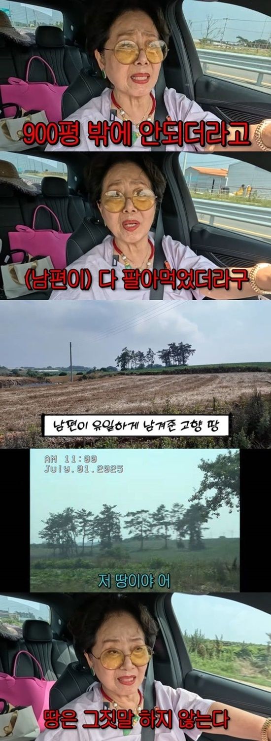 선우용여는 "남편한테 받은 건 그거 하나다. 다른 땅은 다 팔았더라. 선산이라 측량을 해놓았는데, 900평 밖에 안 된다. 몇 만 평은 다 팔아먹었더라"고 털어놓았다.