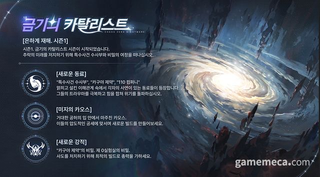 카제나는 서비스 시작과 함께 시즌제 콘텐츠를 선보인다. 대표적인 시즌 콘텐츠는 이벤트 스토리와 고유 콘텐츠가 포함된 ‘은하계 재해’이며, 고유한 꾸미기 보상과 많은 육성 보상을 제공한다. 특히 전용 스토리를 기반으로 한 카오스 임무에서는 새로운 카드∙장비∙운명을 경험할 수 있으며, 획득한 보상은 저장해 다른 콘텐츠에서 쓸 수 있다.
