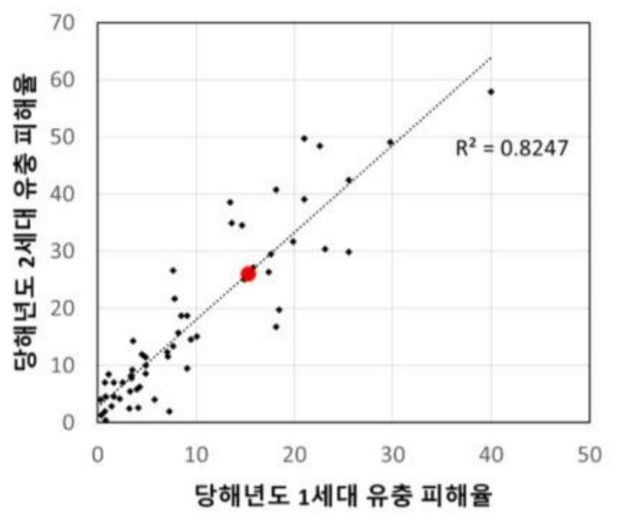 전국 고정 조사구에서 조사된 1세대 피해율과 2세대 피해율이 관계(실측자료), 피해율은 전체 조사목 대비 미국흰불나방 유충 피해가 발생한 비율을 의미하며 빨간 점은 2025년 1세대 피해율(관측치) 대비 예상되는 2세대 피해율(예측치)이다. / 산림청 국립산림과학원 제공