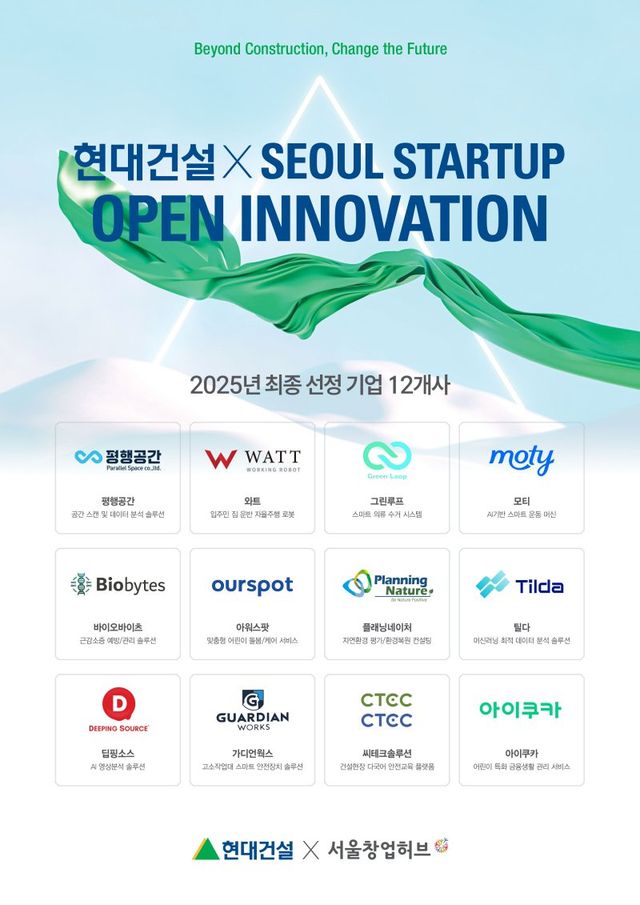 현대건설은 지난 4일 '2025 현대건설 x 서울 스타트업 오픈 이노베이션' 공모전을 통해 혁신 기술을 보유한 12개 스타트업을 최종 선정했다고 10일 밝혔다.