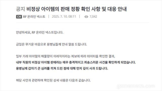 이 사건은 7월 6일에 고객센터에 접수되어 7일부터 조사를 시작했고, 8일에 내부 직원의 아이템 비정상 강화 및 거래 이력을 확인했다. 확인 즉시 이 계정은 영구정지됐고, 직원은 업무 배제됐다.