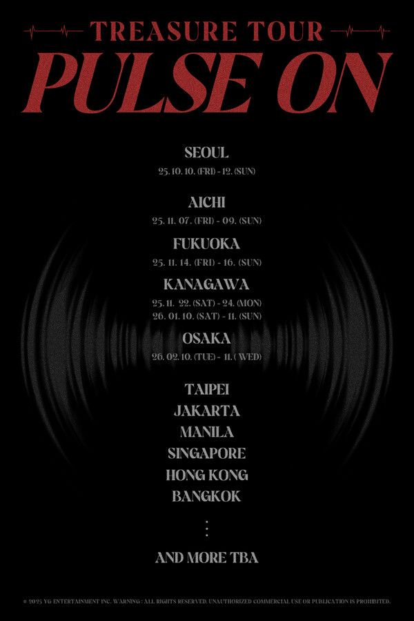 공개된 바에 따르면 트레저 아시아투어 'PULSE ON'은 오는 10월 서울(10월10~12일) 3회차 공연을 시작으로 일본 아이치(11월7일~9일), 후쿠오카(11월 14일~16일), 카나가와(11월22일~24일, 26년 1월10일~11일), 오사카(26년 2월 10일~11일) 등에서 진행된다. 또한 타이베이, 자카르타, 마닐라, 싱가포르, 홍콩, 방콕 공연도 펼쳐질 예정이다.