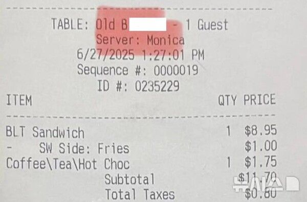 잠시 후 손님들은 황당한 일을 겪었다. 식사를 마치고 받은 영수증에 욕설의 의미가 담긴 'Old B****es' 글자가 적혀 있었기 때문이다. 손녀는 영수증 사진을 함께 공개하며 "살면서 가장 끔찍했던 고객 경험"이라고 분노했다.