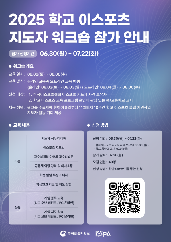 한국e스포츠협회(이하 협회)는 학교 이스포츠 클럽 지도자 양성을 위한 ‘2025 학교 이스포츠 지도자 워크숍’의 참가자를 오는 7월 22일(화)까지 모집한다고 11일(금) 밝혔다.