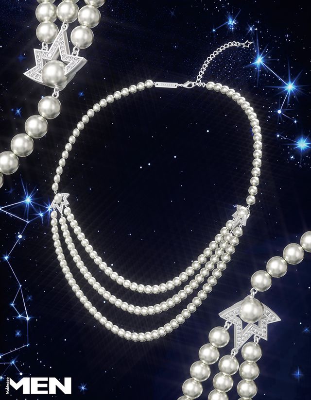진주 하면 떠오르는 단아하고 기품 있는 이미지에서 벗어나 극적이고 풍요로운 아름다움을 담아냈다. 코멧 플러스 컬렉션은 광활한 밤하늘을 가로지르는 혜성의 역동적 모습에서 디자인의 영감을 받았다. 세 줄로 풍성하게 엮은 진주는 데콜테 라인을 환히 밝혀주고, 대칭적으로 자리한 화이트 골드 별 장식은 촘촘히 박힌 다이아몬드가 눈부신 빛을 발한다.