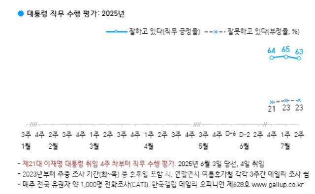 다만 이 대통령의 이번 긍정 평가는 지난주(7월 첫째 주) 65%에서 2%포인트 하락했다. 대출 한도 제한 등 일부 정책이 과거 정부의 부동산 시장 개입과 실책을 떠올리게 했기 때문으로 풀이된다. 민생회복지원금 등에 대한 일부 반대 의견도 있는 것으로 보인다.