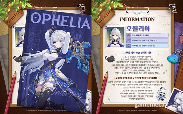 ‘오필리아’는 원작에 등장하지 않았던 ‘몬길: 스타 다이브'의 오리지널 캐릭터다. 따라서 기존에 알려진 정보가 많이 없었으나 최근 넷마블이 공개한 '레나의 인터뷰 파일 - 오필리아편'을 통해 상세 내용을 확인할 수 있었다.