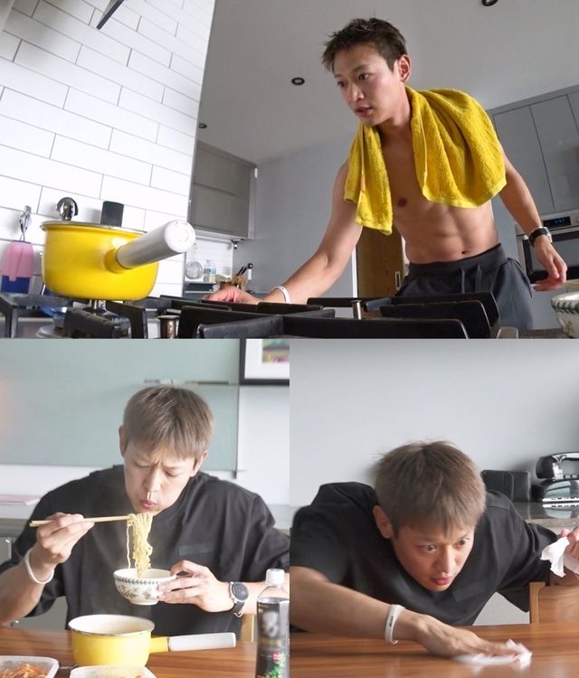 민호는 아침부터 시작된 ‘철인 3종 경기’ 훈련을 마치고 귀가해 첫 끼를 준비한다. 눈 뜬 지 7시간 만에 먹는 첫 끼 메뉴는 바로 라면. 그는 주방을 한 번 스캔하더니 노란 냄비를 들고 자신과의 싸움을 예고하듯 의미심장한 심호흡을 한다.