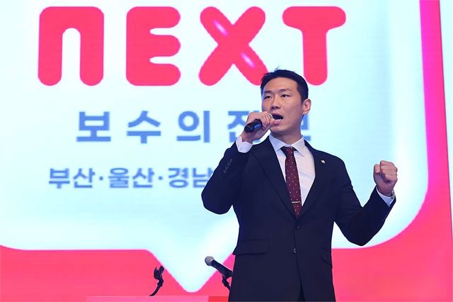 국민의힘 청년최고위원 본경선에 진출한 박상현 군포시의원이 부울경 합동연설회에서 정견을 발표하고 있다.