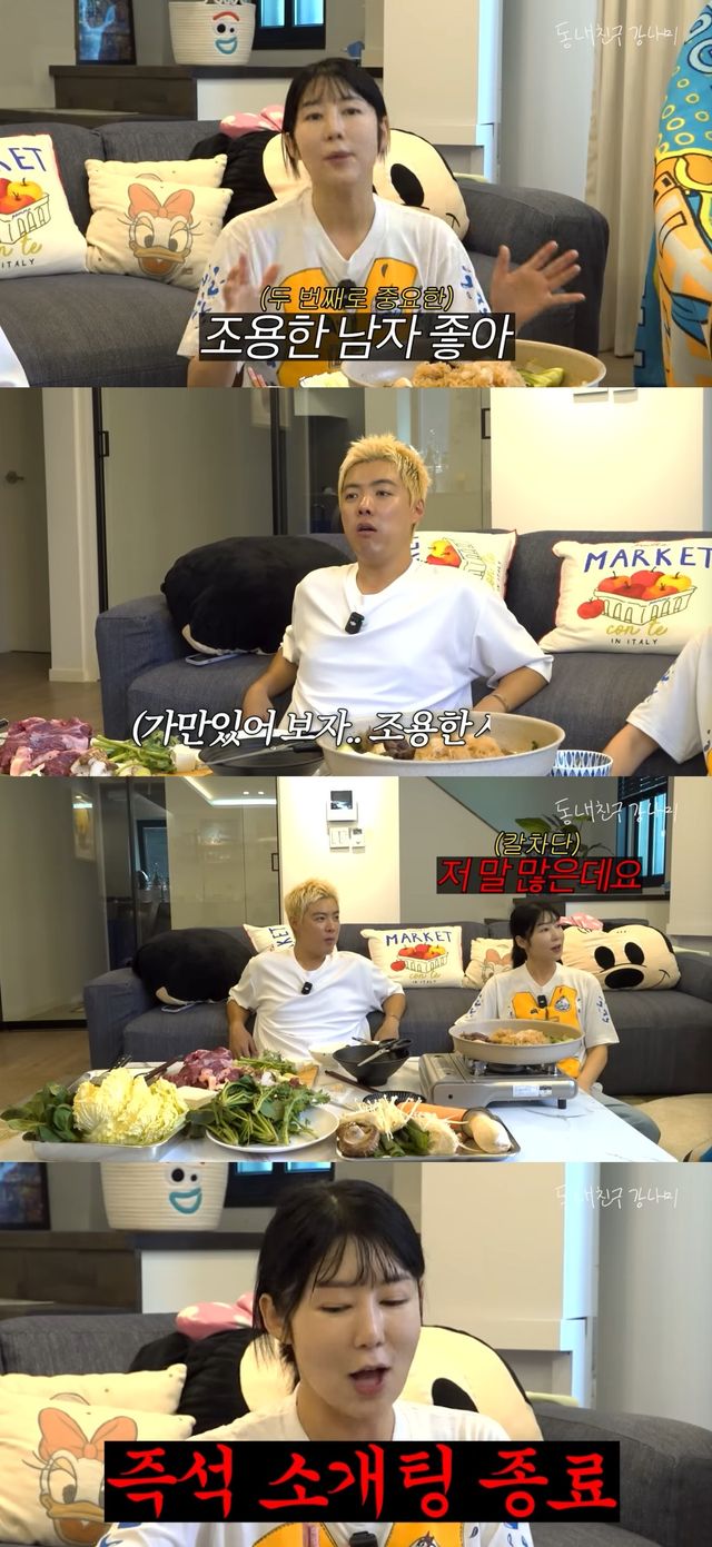 또한 사유리는 "조용한 남자가 좋다"고 덧붙였고, 강남은 말이 없는 남성을 생각하다가 촬영 중인 제작진 한 명을 지목해 "저분 말 없다"고 이야기했다. 이에 제작진은 "나 말 많다"고 단호하게 답했고, 사유리는 "나 까인 거냐. 나도 싫다"고 발끈해 또 한 번 웃음을 자아냈다.