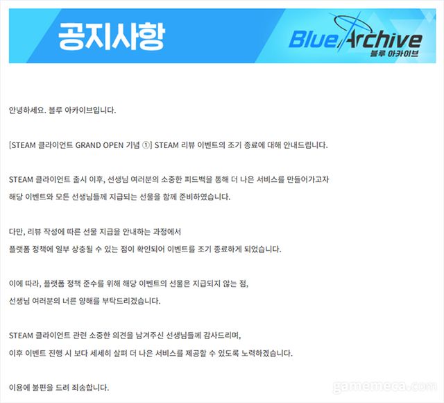 ▲ 블루 아카이브 스팀 리뷰 이벤트 취소 공지 (자료출처: 블루 아카이브 공식 커뮤니티)