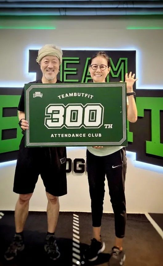 두 사람은 '팀버핏 300번째 출석 클럽(TEAM BUTFIT 300th Attendance Club)'이라고 적힌 팻말을 들었다.