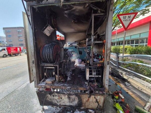 11일 오후 2시22분께 전북 완산구 중노송동에서 하수관로 내부 촬영을 위한 장비가 실린 1t 트럭에서 불이 났다.