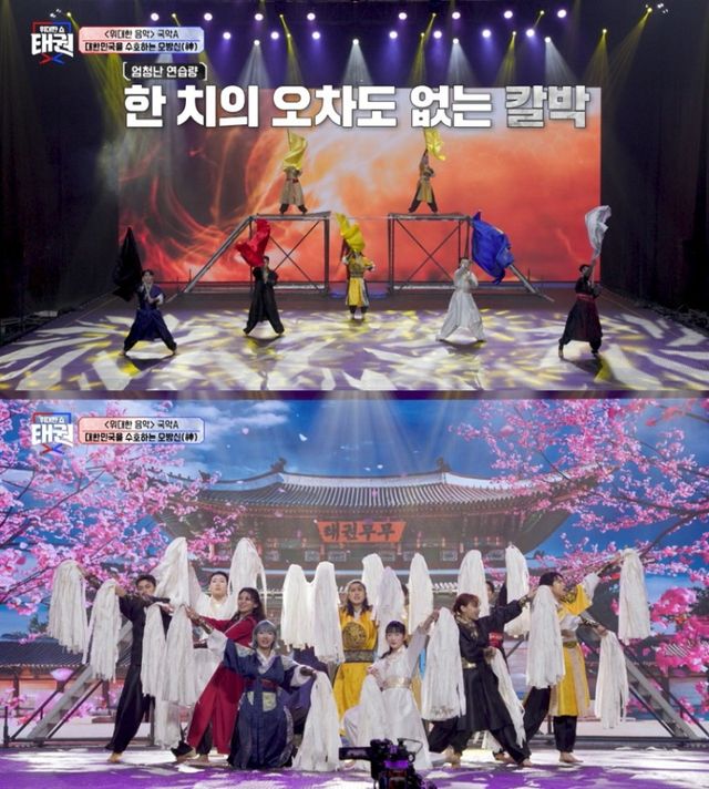 이어진 국악 장르에서는 A팀의 무대가 시작됐다. 국악A팀(팀명 태권무무)의 리더 한승훈은 국악과 태권도를 결합한 무대에 특화된 와이킥 팀의 출신으로 깃발 군무, 검무, 지전 등 전통 요소를 정교하게 구성해냈다. 특히 비전공자인 팀원들에게는 각자의 주 기량을 선보일 수 있도록 개별 퍼포먼스 기회를 부여해 비전공자 최다팀의 시너지를 극대화했다.
