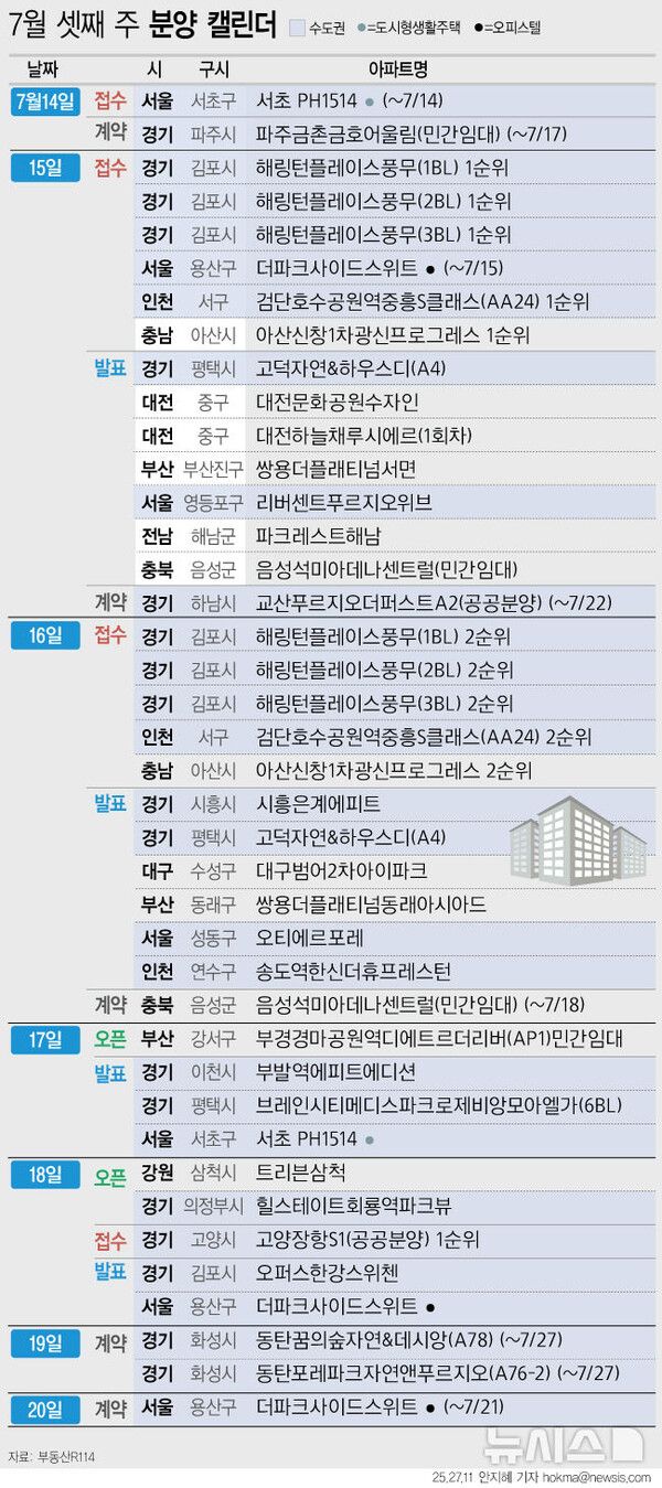 뉴시스 보도에 따르면, 청약 일정은 경기 김포시 풍무동 '해링턴플레이스풍무'(1·2·3블록), 경기 고양시 장항동 '고양장항S1'(공공분양), 인천 서구 불로동 '검단호수공원역중흥S클래스'(AA24) 등에서 진행된다. 견본주택은 경기 의정부시 호원동 '힐스테이트회룡역파크뷰', 강원 삼척시 교동 '트리븐삼척' 등 3곳이 문을 연다.