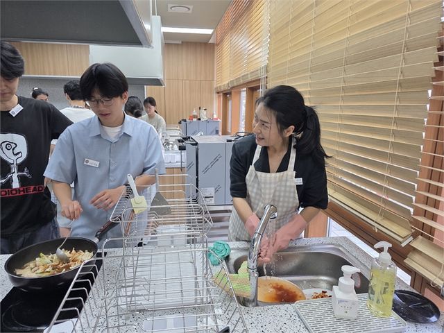 군포시의회 ‘Happy Together 2’에서 이훈미 의원이 청소년과 요리를 함께하며 설거지 중 대화를 나누고 있다.(사진=뉴스영)