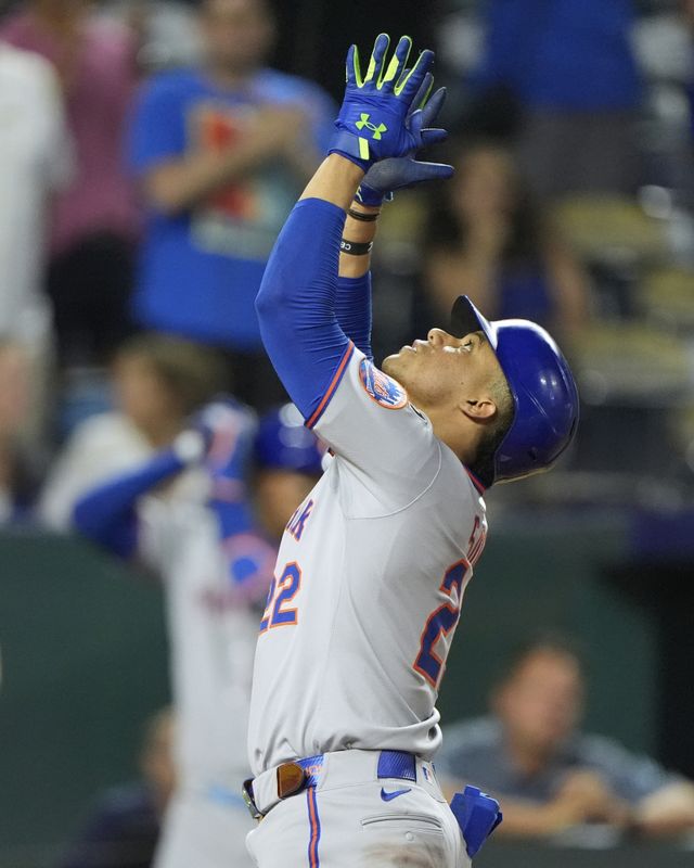 KANSAS CITY, MISSOURI - JULY 11: Juan Soto #22 of the New York Mets is congratulated by teammates after scoring on a Mark Vientos three-run double in the eighth inning against the Kansas City Royals at Kauffman Stadium on July 11, 2025 in Kansas City, Missouri. Ed Zurga/Getty Images/AFP (Photo by Ed Zurga / GETTY IMAGES NORTH AMERICA / Getty Images via AFP)/2025-07-12 14:15:09/ <저작권자 ⓒ 1980-2025 ㈜연합뉴스. 무단 전재 재배포 금지, ai 학습 및 활용 금지>