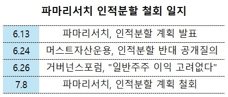 머스트자산운용은 "파마리서치는 분할되는 두 회사의 신주인수권이 종전의 전체 주주에게 주어지는 인적분할을 택해, 자본시장에서 문제 됐던 물적분할과 다르다는 주장을 펴지만 이에 동의하지 않는다"며 "인적분할 뒤 현물출자로 모회사·자회사를 모두 상장시키는 지배구조를 계획하기 때문"이라고 지적했다.
