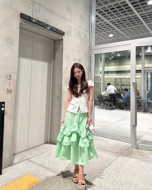유시은이 인스타그램을 통해 선보인 스타일이 눈길을 끈다. 시원한 실내 공간을 배경으로 촬영된 사진에서 그녀는 청량한 민트 컬러의 캉캉스커트를 메인으로 한 여름룩을 완성했다. 상의는 화이트 패턴 베스트로 깔끔하면서도 슬림한 실루엣을 살렸고, 내추럴하게 흐르는 긴 웨이브 헤어가 청순한 이미지를 더했다.
