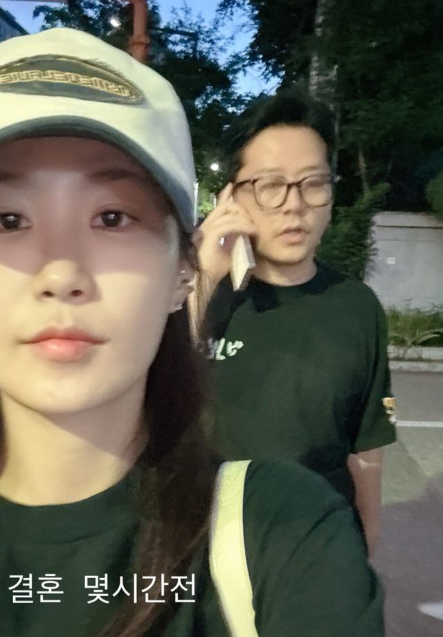 김지민은 12일 자신의 SNS에 “결혼 몇 시간 전”이라는 글과 함께 사진을 게재했다. 사진 속에는 밤길을 걷고 있는 두 사람의 모습이 담겨 있다. 화장기 없음에도 빼어난 미모의 김지민과 전화 통화를 하며 걸어가고 있는 김준호의 모습이 인상적이다.
