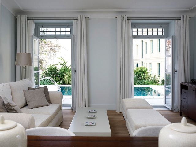 넓은 야외 정원을 포함한 전용 수영장이 있는 스위트룸.