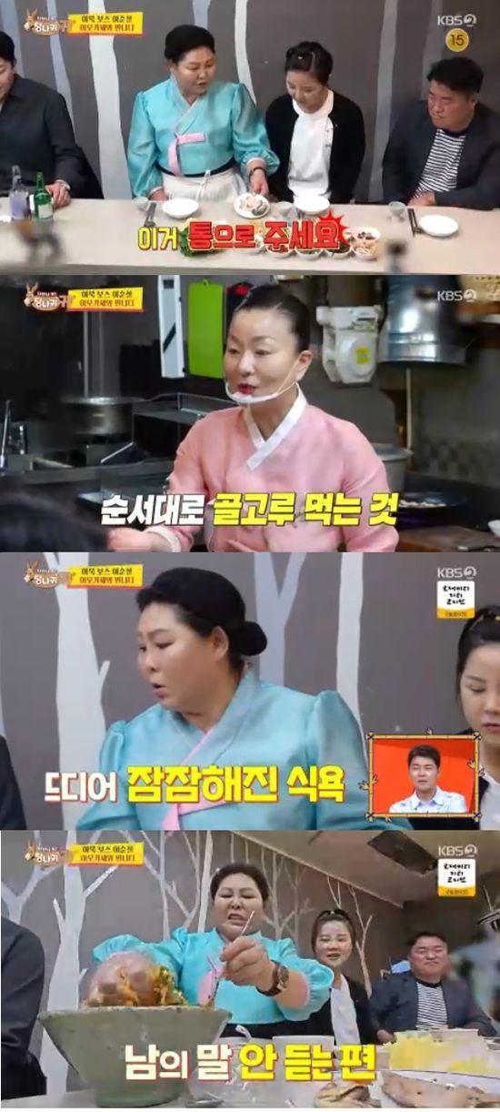 13일 방송된 KBS 2TV '사장님 귀는 당나귀 귀'에서는 김미령이 이순실에게 코스요리를 가르치는 모습이 전파를 탔다.
