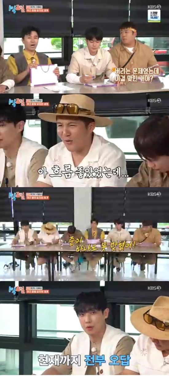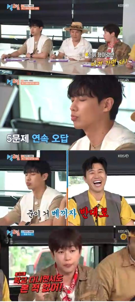 이준은 1번 문제를 시작으로 계속 오답 퍼레이드를 펼쳤다. 김종민은 "지금 준이가 하나도 못 맞혔다"고 말했다.
