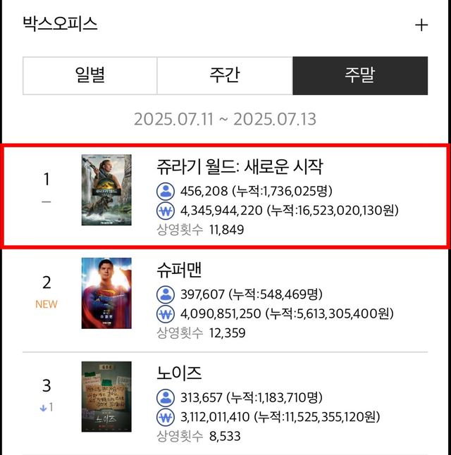 한편, 13일 박스오피스에서는 ‘쥬라기 월드’에 이어 ‘슈퍼맨’이 141,174명의 관객을 모으며 일일 박스오피스 2위를 차지했다. 그 뒤로 ‘노이즈'(119,922명), ‘F1 더 무비'(106,177명), ‘드래곤 길들이기'(18,442명)가 박스오피스 상위권에 이름을 올렸다.