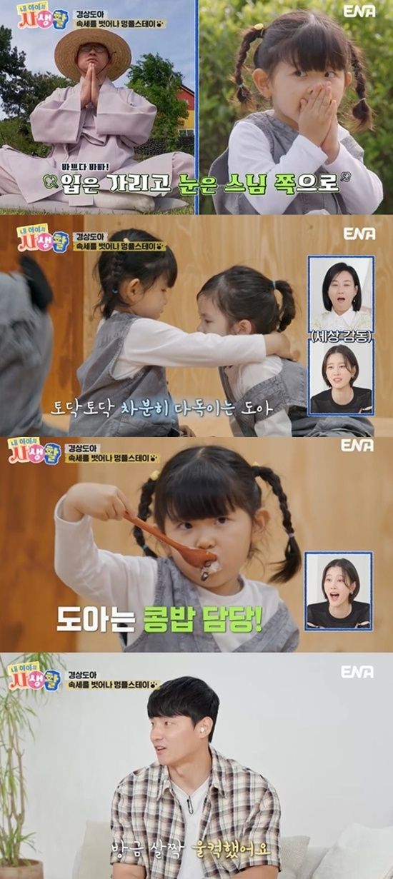 13일 방송된 ENA 일요예능 ‘내 아이의 사생활’(이하 ‘내생활’) 29회에서는 조부모님의 결혼 50주년을 맞아, 신혼여행지였던 경주로 ‘손주투어’를 떠난 도도남매 연우, 하영이와 반려견 성탄이와 함께 ‘멍플스테이’(강아지+템플스테이)를 떠난 도아의 이야기가 그려졌다.