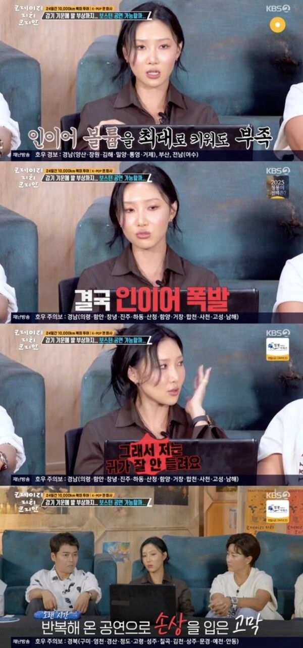 곽튜브가 "터지면 귀 다친 거 아니냐"고 묻자, 화사는 "그래서 저는 이쪽(왼쪽 귀) 귀가 잘 안 들린다"라고 담담하게 답했다. 놀란 전현무가 "이 공연 때문에?"라고 되묻자, 화사는 "그건 아니다. 저는 크게 들어야 해서 고막이 조금 안 좋다. 이명도 항상 들린다"라고 전해 안타까움을 더했다.