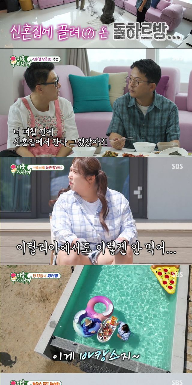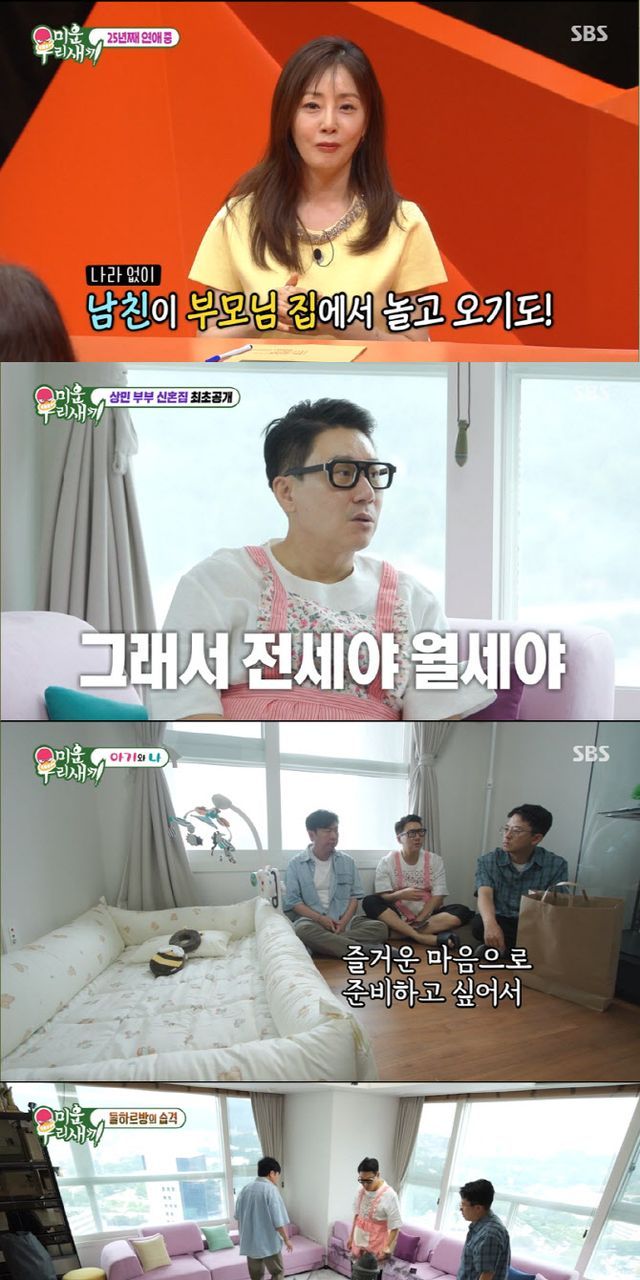 이어 남산이 보이는 탁 트인 전망의 신혼집이 공개되며 스튜디오에서는 탄성이 흘렀다. 상민의 이사를 축하하기 위해 방문한 임원희와 김준호는 “지난 집에서는 홀아비 냄새가 났는데 확실히 이 집은 다르다”라며 감탄했다. 김준호는 “지민이가 신혼집에 내 물건은 아무 것도 가지고 오지 말라고 한다”라고 말했고, 이상민 역시 “아내가 내 물건 중 버릴 걸 버리고 자기 짐을 옮긴다고 한다”라며 약한 남편의 모습을 보였다.