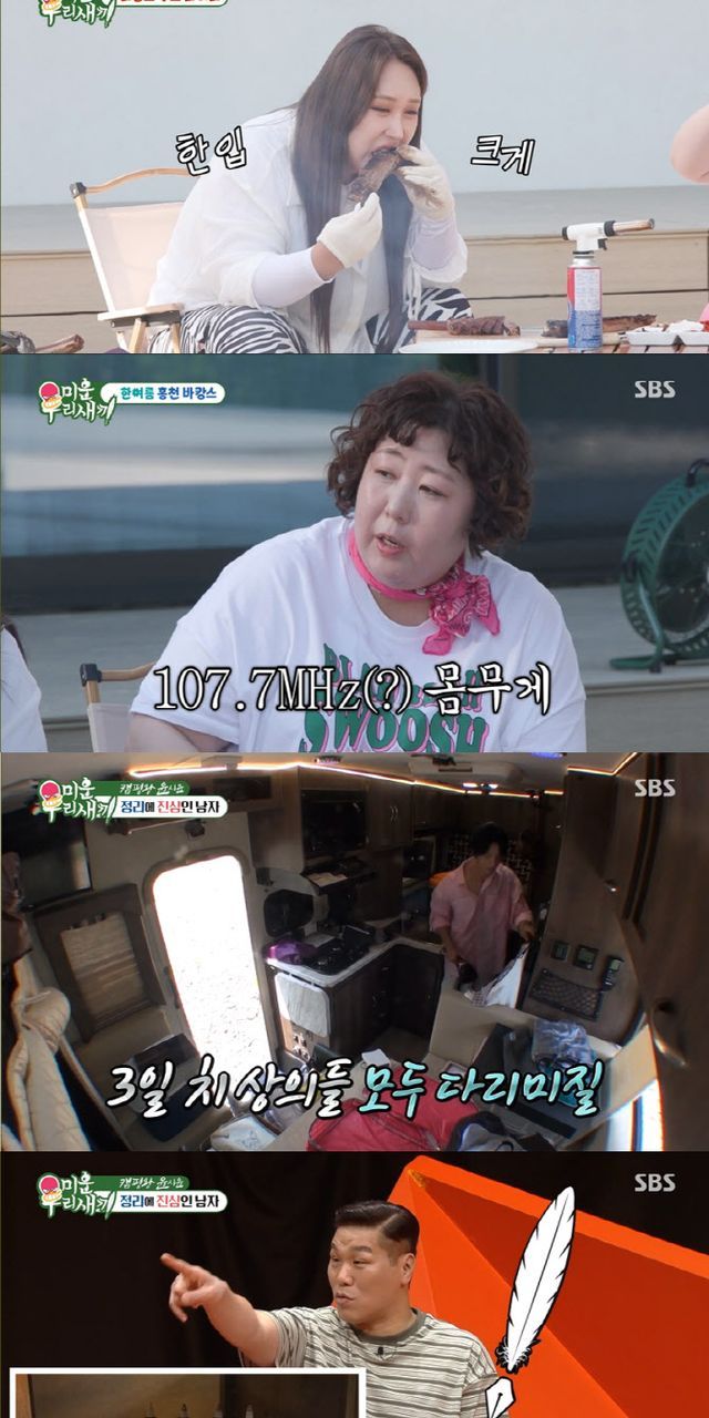 오랜만에 한혜진의 홍천 라이프가 공개됐다. 풍자와 신기루를 위해 특급 바캉스를 계획한 한혜진은 피자 화덕을 만들어야 한다며 벽돌을 들고 나타나 두 사람을 당황하게 만들었다. 무더위 속 어렵게 화덕을 만든 세 사람. 풍자는 “이태리 사람도 이렇게는 안 먹는다”라며 불평했다. 풍자와 신기루가 수영장에 들어가자 물이 폭포처럼 넘치며 스튜디오에 폭소가 터 나왔다. 한혜진과는 상반되게 홍학 튜브에 올라가지 못하고 고군분투하던 풍자와 신기루는 “버려라”라며 홍학 튜브에 주먹질을 하는 모습으로 웃음을 자아냈다. 우대 갈비를 먹던 신기루는 뜨거운 토치가 다리에 닿아 바지에 구멍이 나는데도 묵묵히 고기를 먹는 ‘진정한 테토녀’의 모습을 보였다. 한편 신기루는 “주변에서 윤화도 풍자도 살을 빼니까 나만 크면 어떡하나 생각이 든다”라면서 자신의 리즈 시절 몸무게를 “107.7 주파수 몸무게다”라고 밝혔고, 풍자는 “지금은 주파수가 잡히지도 않는다”라고 거들었다.